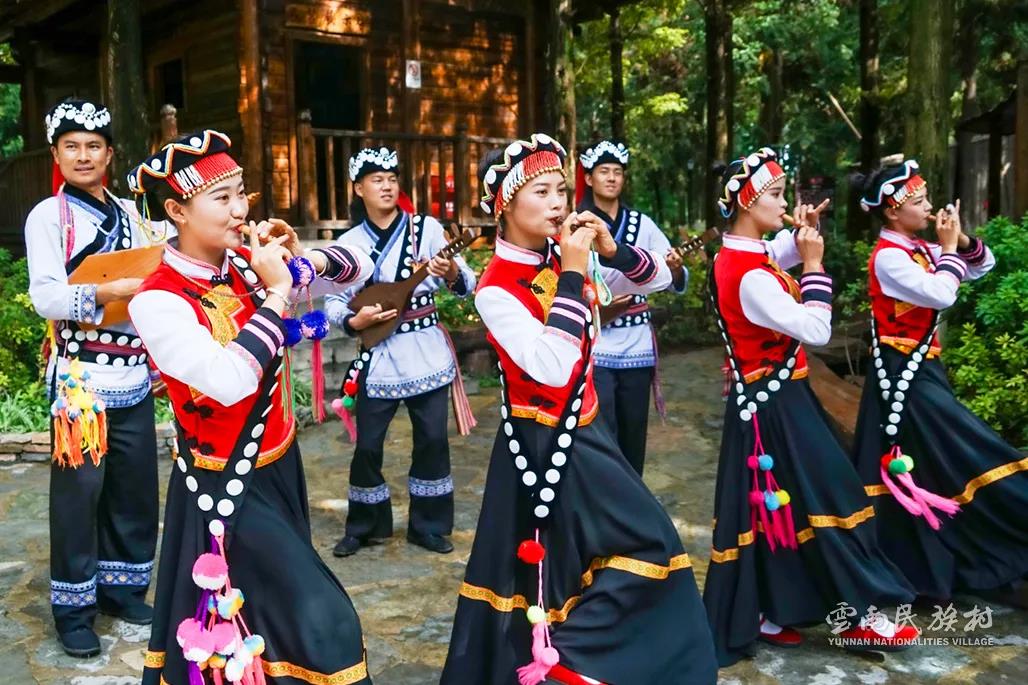 彝族在云南境內(nèi)約471萬(wàn)人,是省內(nèi)人口最多、分布最廣的少數(shù)民族,主要聚居在金沙江、元江流域和哀牢山、無(wú)量山腹地。彝族是一個(gè)能歌善舞的民族,民間打歌、跳樂(lè)之風(fēng)盛行,大三弦、跌腳舞久負(fù)盛名。火把節(jié)是彝族最具特色的民族節(jié)日。彝族村占地50余畝,三虎浮雕墻與虎頭內(nèi)祖師形象表現(xiàn)了彝族虎鷹文化。太陽(yáng)歷廣場(chǎng)圖騰柱上有太陽(yáng)、虎、火和八卦圖形象,周圍環(huán)繞著10個(gè)朝向不同的月球造型,外圓周有12生肖石雕。依山而建的“...